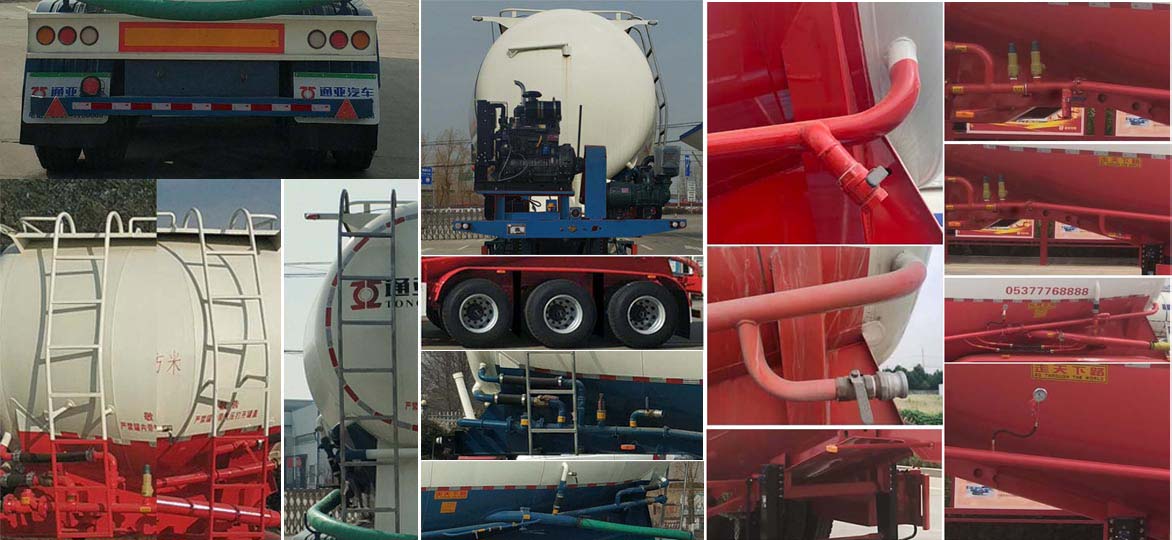 產品名稱: 通亞達牌CTY9405GFLDC50低密度粉粒物料運輸半掛車 外形尺寸: 11400,11150,10600,10500×2550×4000,3990,3900,3850,3800(mm)