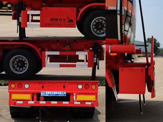| 采用適用于牽引危險品運輸半掛車的牽引車,危險貨物運輸車輛類型:FL型,準運介質的最大密度:900千克/立方米;罐體總容量35.7立方米,罐體有效容積:33.8立方米,保溫層內部罐體外形尺寸為:長9700mm,寬2350mm,罐體為鵝頸式,前端高度:1950mm,后端高度:2150mm,當保溫層厚度為50mm時,罐體(含保溫層)外形尺寸為:長9800mm,寬2450mm,罐體為鵝頸式,前端高度:2050mm,后端高度:2250mm;當保溫層厚度為80mm時,罐體(含保溫層)外形尺寸為:長9860mm,寬2510mm,罐體為鵝頸式,前端高度:2110mm,后端高度:2310mm,當保溫層厚度為100mm時,罐體(含保溫層)外形尺寸為:長9900mm,寬2550mm,罐體為鵝頸式,前端高度:2150mm,后端高度:2350mm;該車采用空氣懸架,安裝盤式制動器;EBS系統生產廠家:廣州瑞立科密汽車電子股份有限公司;EBS型號:CM-TEBS;側面及后下部防護裝置所用材料材質均為:Q235,側面及后下部防護裝置與車輛連接方式均為:螺栓連接,后部防護裝置的主要尺寸參數:斷面尺寸(mm)為120×68,離地高度為:500mm. | |||