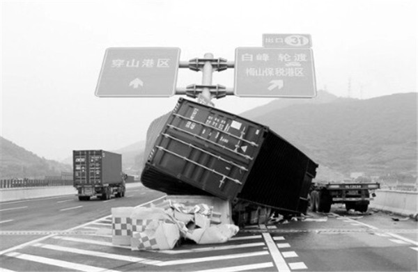4、2013年12月7日,一集裝箱卡車在甬金高速車速過快,集裝箱甩出。。。
