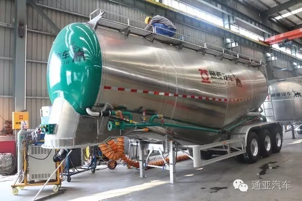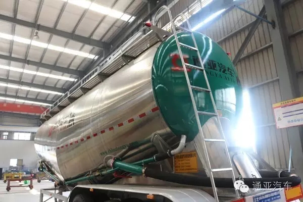 今年隨著GB1589政策的實施和9.21五部門共同治超,通亞汽車研發了全國最輕、中國第一臺鋁合金粉粒物料運輸半掛車。采用鋁合金罐體,與鋼制罐體相比自重更輕,運輸噸位更高,更適合目前計重收費的運輸環境。整車自重僅5T。并在第十二屆中國(梁山)專用汽車展覽會首次亮相。